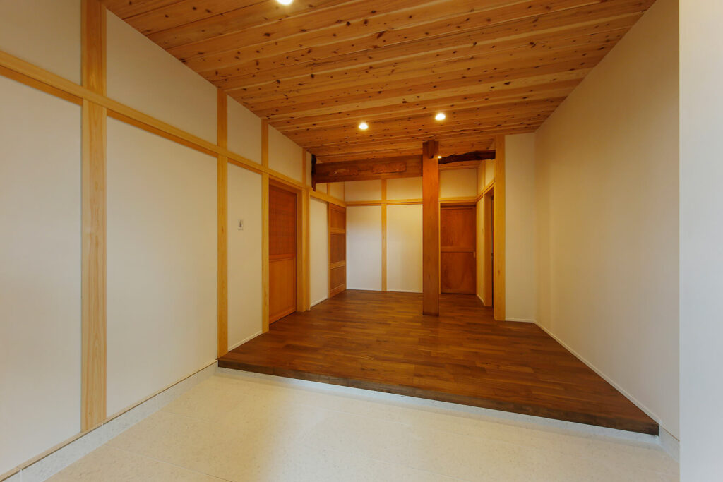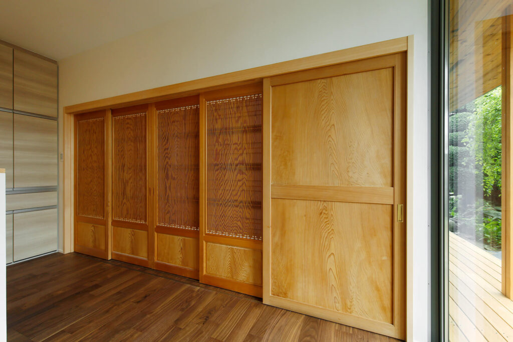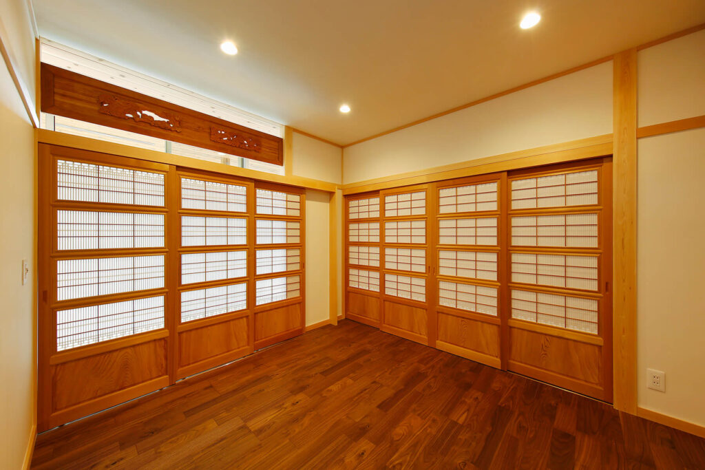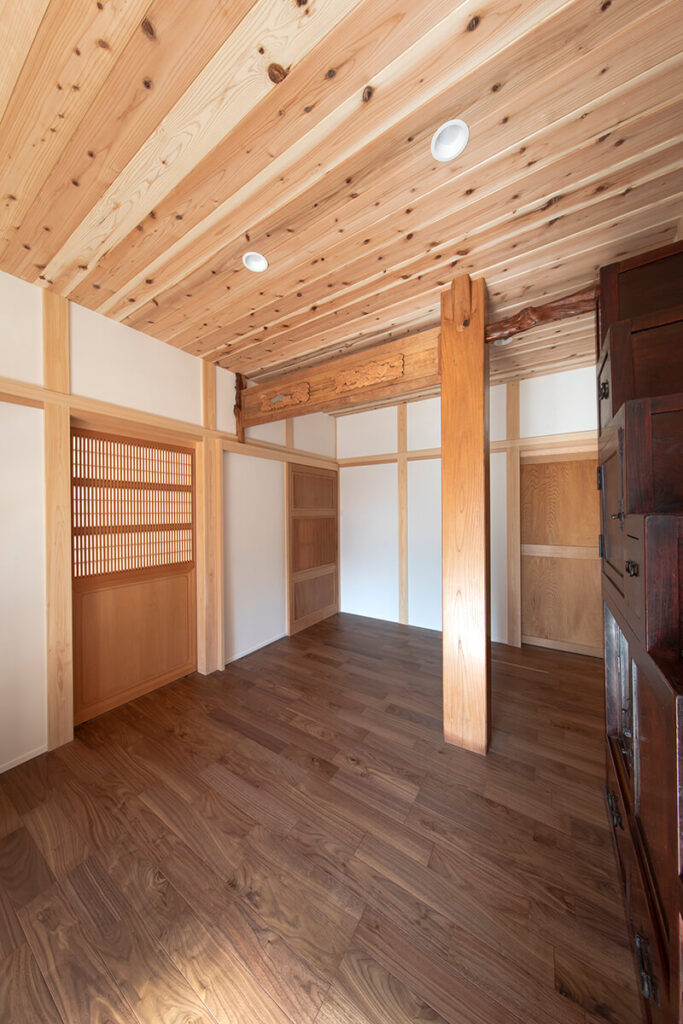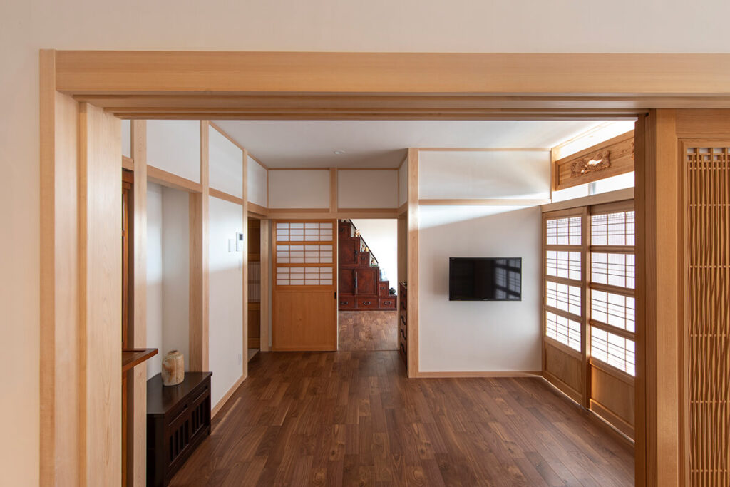 1階では壁の造り方を真壁にし、元々の建物で使用していた大黒柱や欄間、建具などを再利用。愛着のある部材や家具を使用しつつ、ご要望頂いていた和モダンのテイストに仕上がっている。