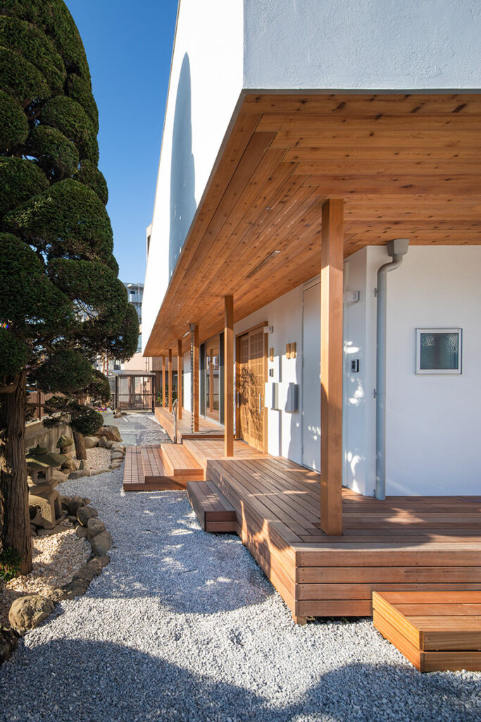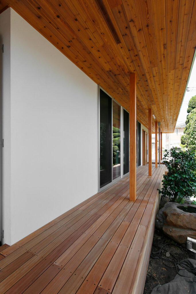 1階よりも2階の方が面積が広く、2階部分を柱で支えるような造りにし、1階部分の外周部には縁側(ウッドデッキ)を全周に設けている。