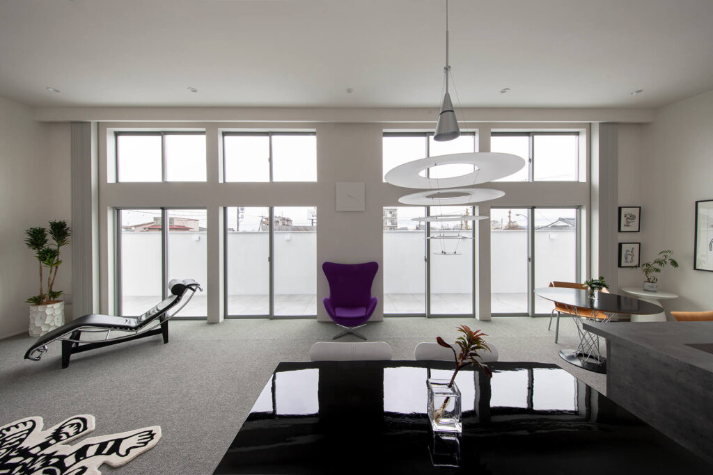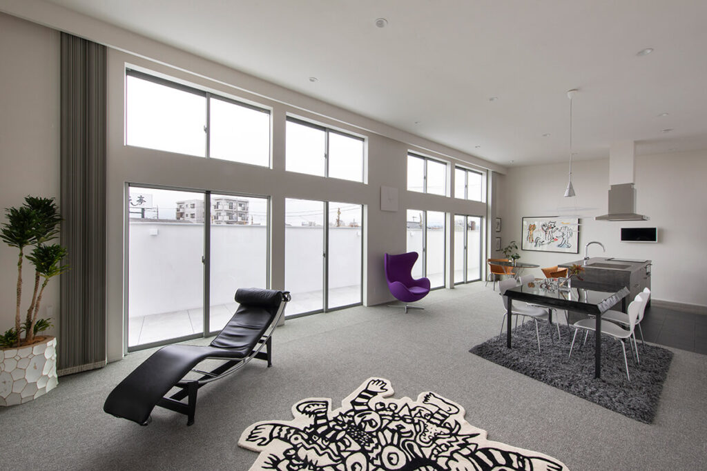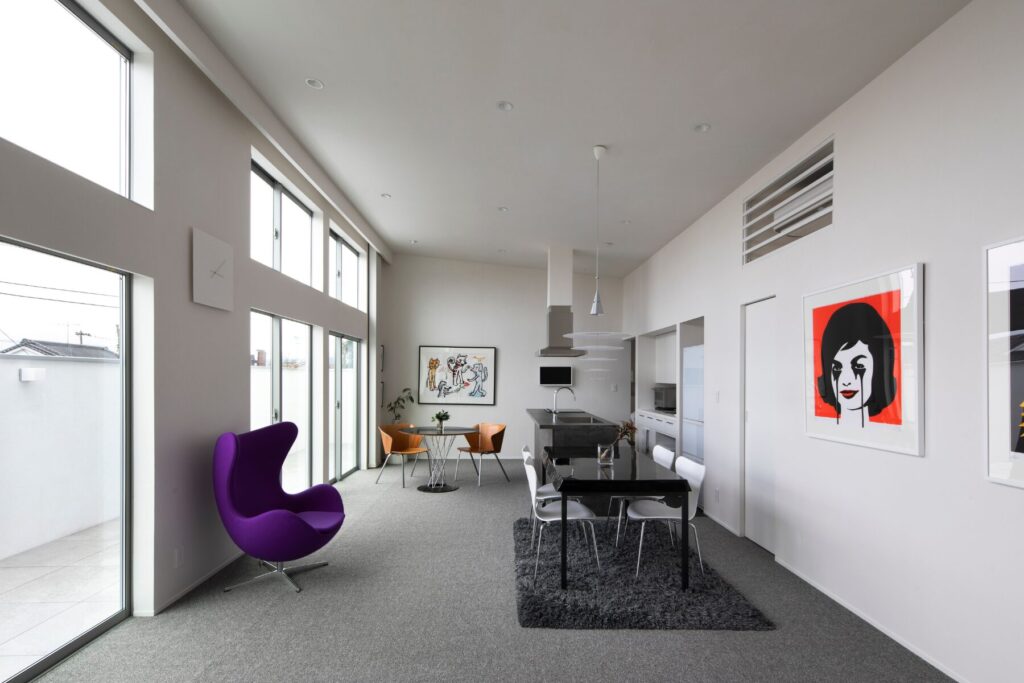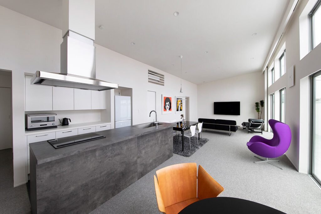 一方の2階は全く違うテイストのシンプルモダンな空間に。持ち込まれる家具や絵画、インテリアが明確であったためそれを考慮しつつ、シンプルで余計な物が無い空間にしたいというご要望を形にしている。